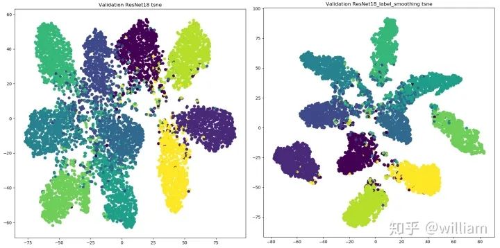从上图看出,标签平滑为最终的激活产生了更紧密的聚类和更大的类别间的分离,实现更好的泛化。
