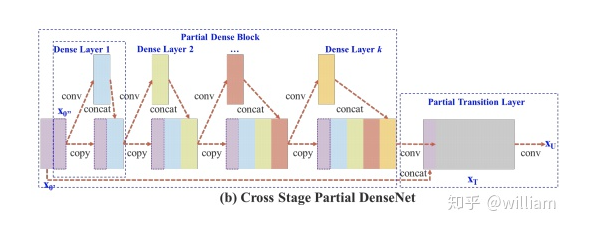 CSPNet实际上是基于Densnet的思想,复制基础层的特征映射图,通过dense block 发送副本到下一个阶段,从而将基础层的特征映射图分离出来。这样可以有效缓解梯度消失问题(通过非常深的网络很难去反推丢失信号) ,支持特征传播,鼓励网络重用特征,从而减少网络参数数量。