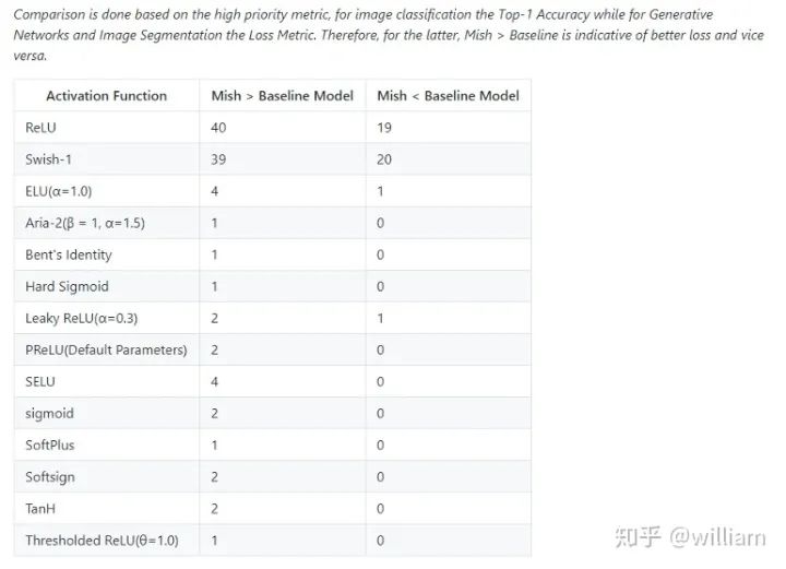 Mish在39个基准测试中击败了Swish,在40个基准测试中击败了ReLU,一些结果显示基准精度提高了3–5%。但是要注意的是,与ReLU和Swish相比,Mish激活在计算上更加昂贵。