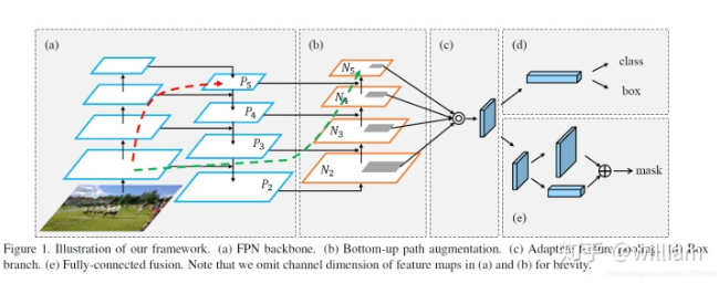 PANET基于 Mask R-CNN 和 FPN 框架,同时加强了信息传播。该网络的特征提取器采用了一种新的增强自下向上路径的 FPN 结构,改善了低层特征的传播。第三条通路的每个阶段都将前一阶段的特征映射作为输入,并用3x3卷积层处理它们。输出通过横向连接被添加到自上而下通路的同一阶段特征图中,这些特征图为下一阶段提供信息。同时使用自适应特征池化(Adaptive feature pooling)恢复每个候选区域和所有特征层次之间被破坏的信息路径,聚合每个特征层次上的每个候选区域,避免被任意分配。
