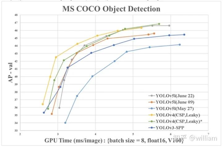 在上面的两个图中,FPS与ms/img的关系是反转的,经过单位转换后我们可以发现,在V100GPU上YOLO V5可以达到250FPS,同时具有较高的mAP。