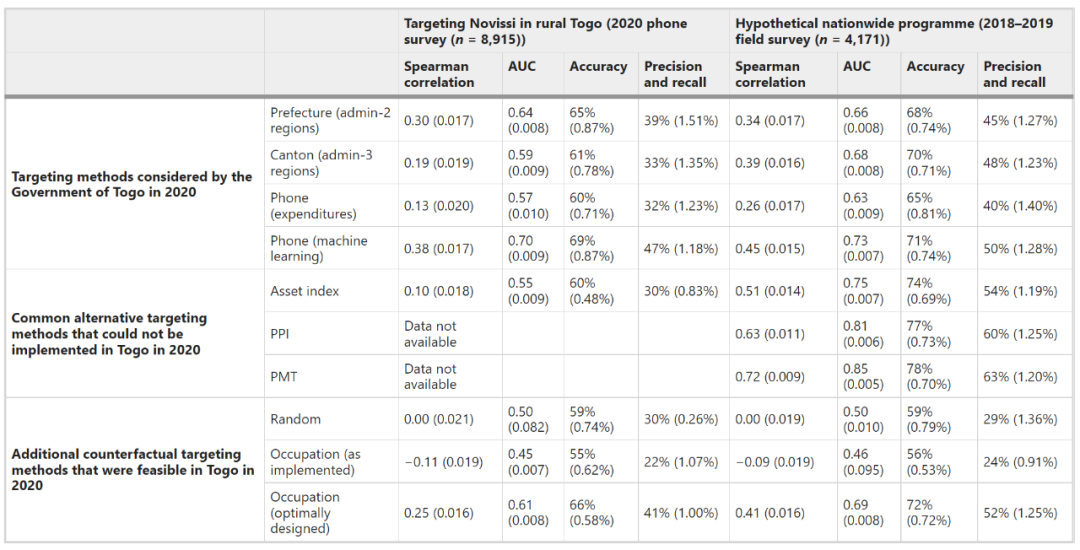 使用 PMT 作为真实贫困状况的衡量标准,基于电话的定位(曲线下面积 (AUC) = 0.70)优于针对农村 Novissi 援助的其他可行方法(例如,地域范围定位的 AUC = 0.59-0.64)。
