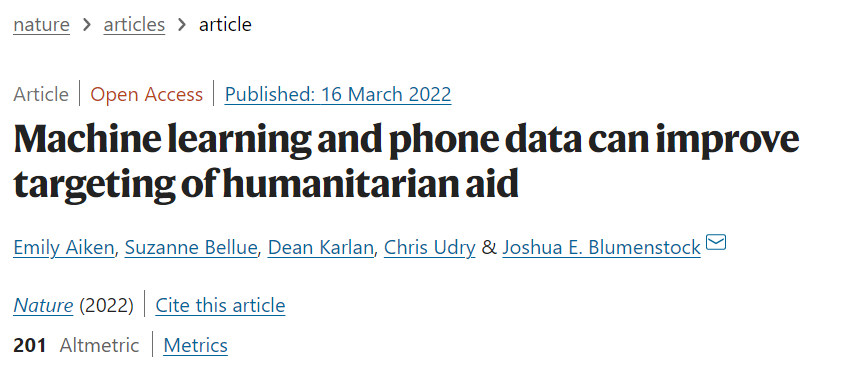 在近日发表在 Nature 上的论文《Machine Learning and Phone Data can Improve Targeting of Humanitarian Aid》中,来自加州大学伯克利分校、德国曼海姆大学、美国西北大学的研究者展示了利用手机网络的数据可以提升人道主义救援的针对性。
