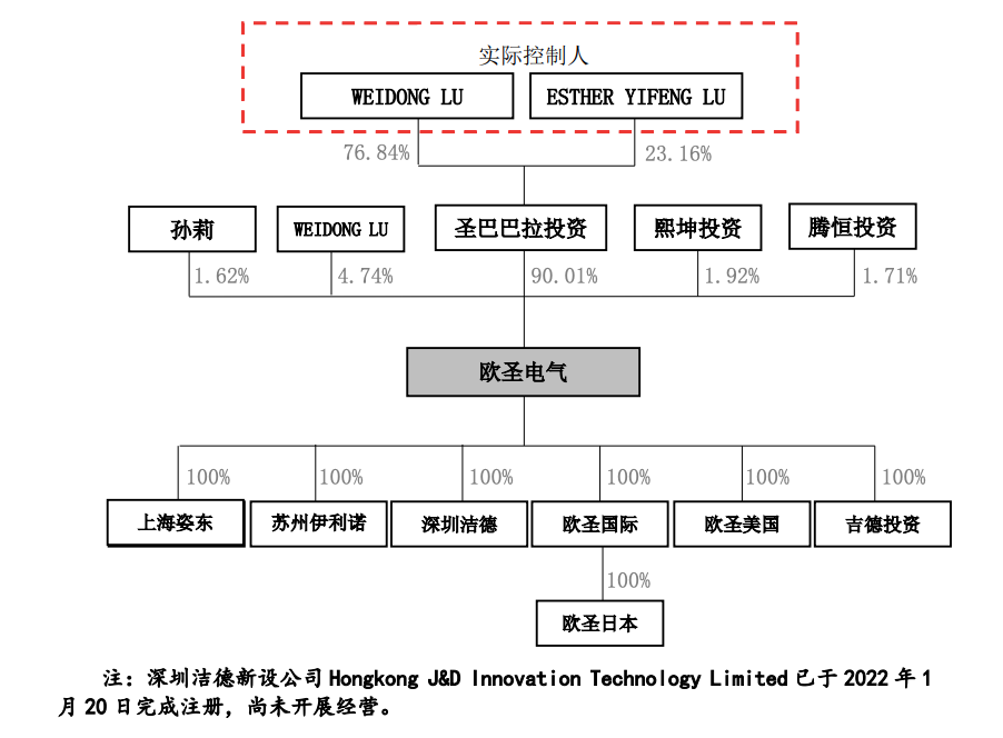 欧圣电气控股股东为陆为东两父女,合计持股94.74%。