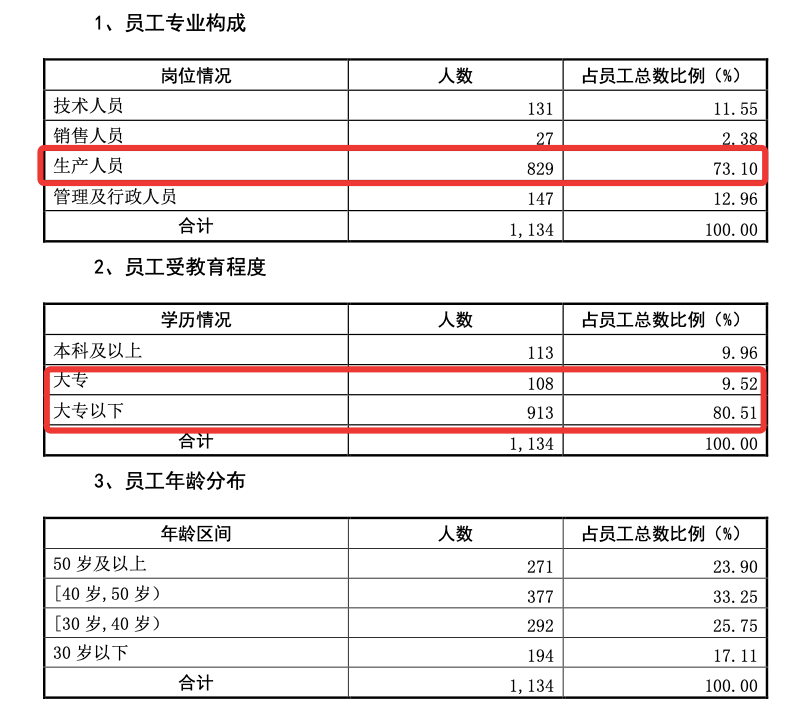 最后在人员构成方面可以发现,欧圣电气更偏向一个外贸公司,离品牌公司距离还比较远。1134名员工中,其中90%学历在大专及以下,且七成员工负责生产。真正的研发投入占比比较少。