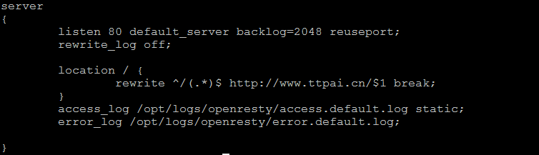 这样做是为了设置backlog,以及启用reuseport功能,backlog是所有虚拟主机公用的,所以当你的Nginx要提供的服务很多时,增加default server中的backlog。加入reuseport可以让所有的worker都监听在80端口,提高Nginx的并发性能,reuseport与accept_mutex是互斥的。另外如果要启用SO_TCPKEEPALIVE机制,需要在listen指令中配置so_keepalive=on