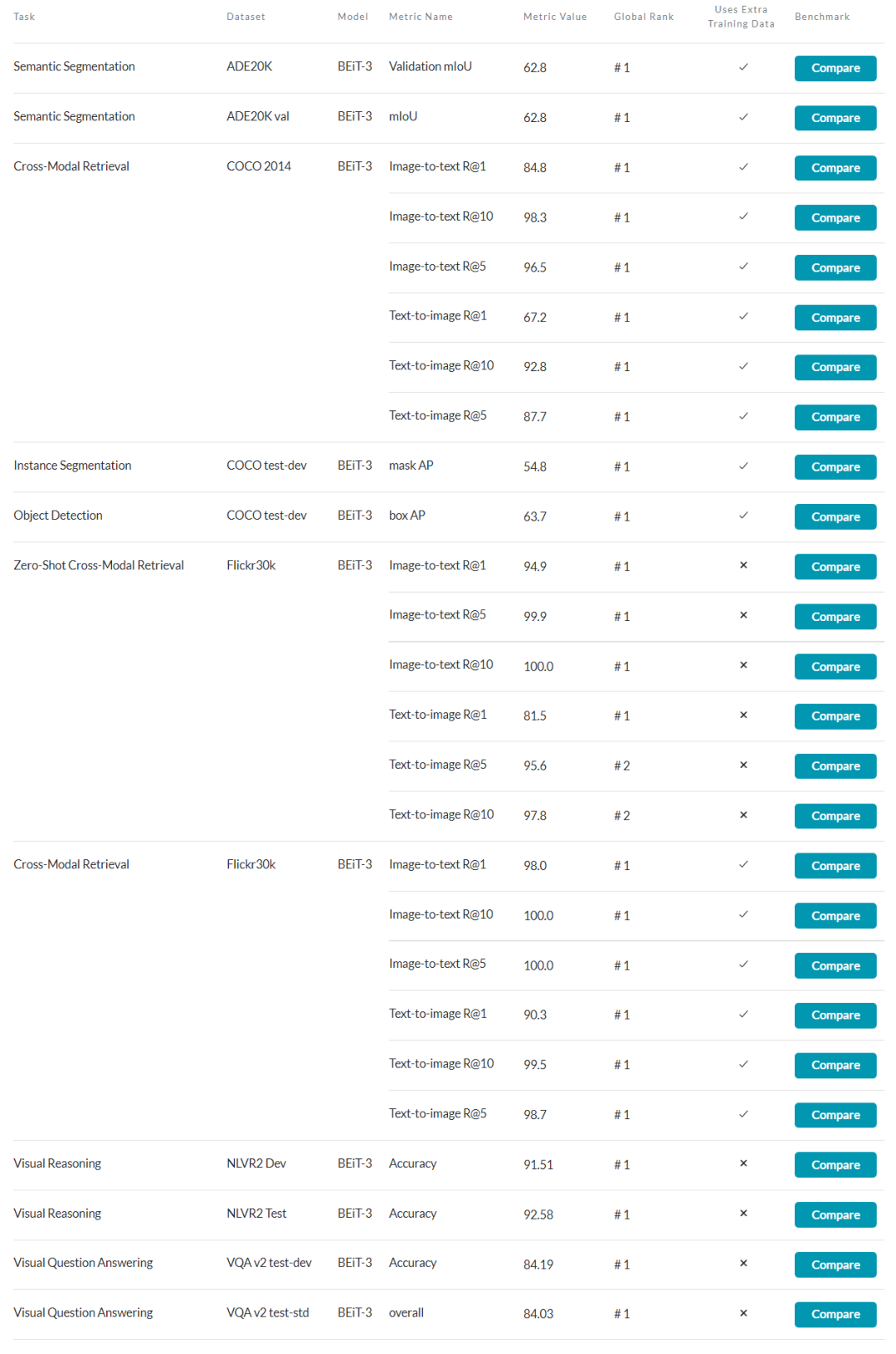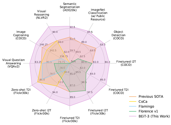 近期,微软亚洲研究院联合微软图灵团队推出了最新升级的 BEiT-3 预训练模型,在广泛的视觉及视觉-语言任务上,包括目标检测(COCO)、实例分割(COCO)、语义分割(ADE20K)、图像分类(ImageNet)、视觉推理(NLVR2)、视觉问答(VQAv2)、图片描述生成(COCO)和跨模态检索(Flickr30K,COCO)等,实现了 SOTA 的迁移性能。BEiT-3 创新的设计和出色的表现为多模态研究打开了新思路,也预示着 AI 大一统渐露曙光。(点击阅读原文,查看 BEiT-3 论文)