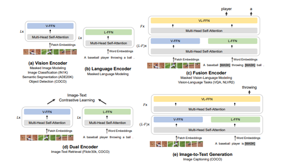 首先,骨干网络逐渐统一。模型架构的统一,为预训练的大一统提供了基础。在这个思想指引下,微软亚洲研究院提出了一个统一的骨干网络 Multiway Transformer,可以同时编码多种模态。此外,通过模块化的设计,统一架构可以用于不同的视觉及视觉-语言下游任务。受到 UniLM(统一预训练语言模型)的启发,理解和生成任务也可以进行统一建模。