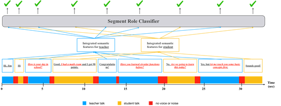 图1(a):课堂活动检测数据形式在正式开始介绍我们的方法之前,首先描述一下本文实验所基于的数据形式。首先,我们的音频数据均来源于教室内单一的麦克风,收录了整节课堂的完整录音。我们的文本数据来源于使用自动语音识别(ASR)系统对麦克风收录得到的课堂录音进行转录得来。图1(a)中展示了一段学生与老师的对话数据,图中文本框的颜色区分了不同的说话人,蓝色文本框表示老师说话内容,黄色文本框表示学生说话内容。从图中我们可以看出,对话的内容包含大量的信息,其中一些句子可以非常容易的分辨出说话人的角色。以第三个句子为例,该说话人说:“How is your day in school”,从句子的内容可以很容易的判断出该说话人应该是老师。然而,并不是所有的句子都像这样容易判断,比如图中对话的前两句问候语句,很难分辨出说话人是老师还是学生。