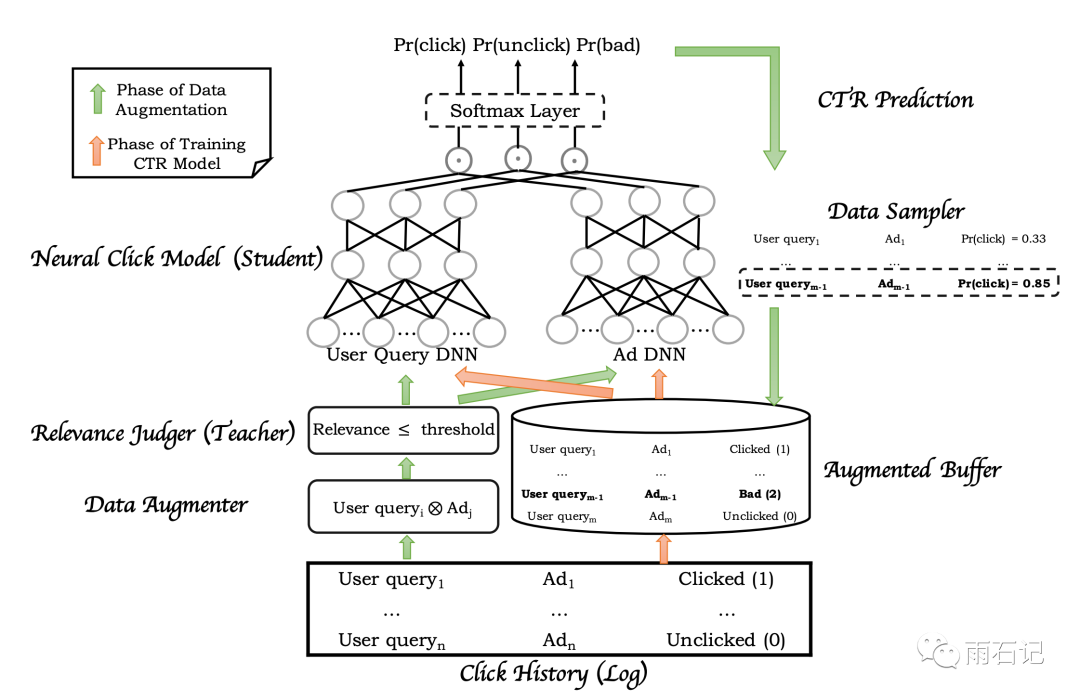 在数据增强这一步,首先,载入点击历史,得到ad-query对,然后找到ad的集合和query的集合,去做笛卡尔集。然后teacher模型给每一个query-ad对一个评分,用一个threshold来把低相关度的query-ad对找到。再把这些query-ad对fed给CTR模型,找到低相关度高CTR的数据作为bad case。