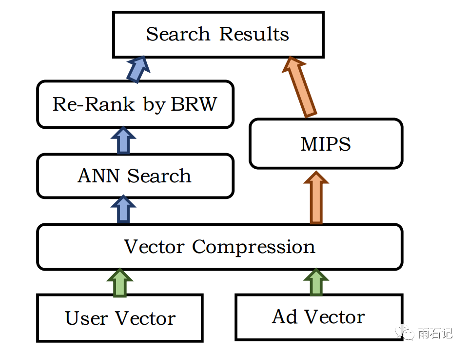 因而论文采用了ANN去做近似搜索,在上面的模型中,user query被embedding成三个向量,而ad也被embedding成三个向量,然后它们做内积再输入给softmax层,这就使得ANN搜索成为了可能,即直接使用embedding后的向量去做内积然后排序进行搜索。