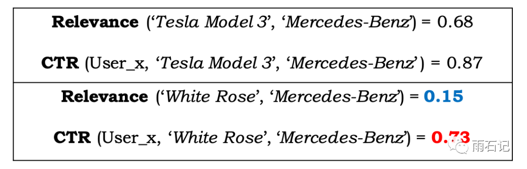 Tesla Model 3和Mercedes-Benz都是出现比较频繁的数据,White Rose 则不是。这里Tesla Model 3和Mercedes-Benz能够给出正确的相关度和CTR估计。但是对于White Rose而言,相关度确实很低,但是CTR评分却很高,导致了不正确的广告出现了。