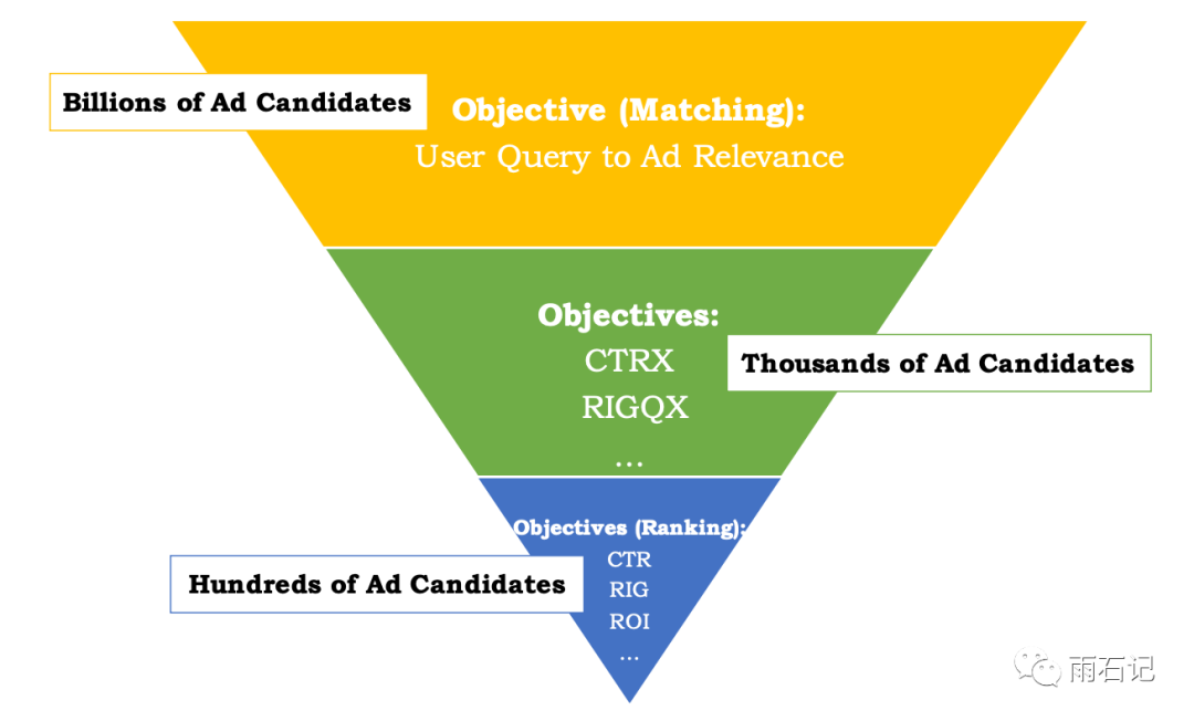 这个架构从速度的角度考虑运行的完全没有问题,但是从目标的角度考虑,就有问题了,问题在于最前面的Matching算法跟最后的Ranking算法的目标不一致,这就会导致在最后排序的时候,可能最相关的广告并不在候选集合中,即便排的再好也无济于事。