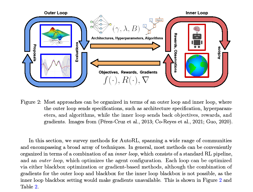 我们的论文结构如下。在第2节中,我们描述了形式化AutoRL问题所需的背景和符号,然后形式化这个问题,并讨论了评估它的各种方法。然后,我们简要地总结了各种类型的RL算法,然后描述了AutoRL问题特有的非平稳性。在第3节中,我们讨论了需要自动化的AutoRL问题的各种组件,包括环境、算法、它们的超参数和架构。在第4节中,我们提供了一个分类,并在该分类之后的子节中调研了当前的AutoRL方法。在第5节中,我们将讨论各种公开可用的基准测试及其应用领域。最后,在第6节中,我们讨论了AutoRL的未来方向。