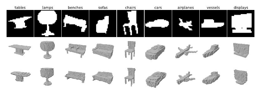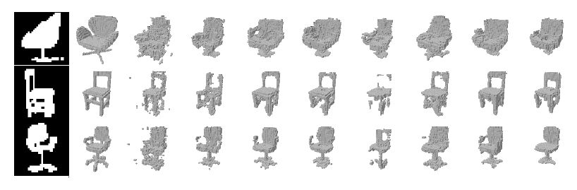 该图最上面的一行表示输入图像(32x32灰度图)。中间一行和最底部一行则分别是相应的ground truth体素和模型生成的体素。