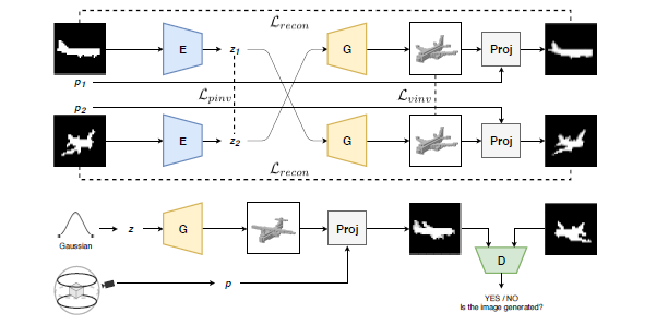 本文使用对抗损失来学习无标签图像,如图1底部所示。直观来讲就是让解码器G学习生成三维体素网格。当从一个任意视点投射时,三维体素网格应该生成一张与真实图像无二致的图像。