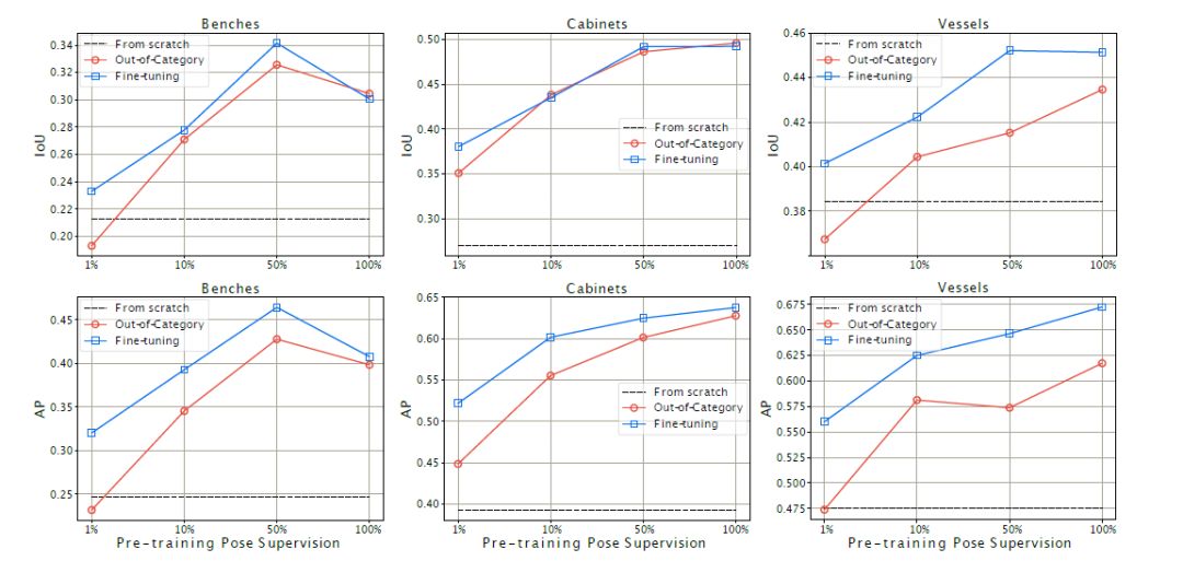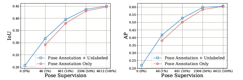 2、本文发现基于类别的监督是不必要的,但是基于姿态的监督十分必要。研究表明,在拥有足够多的姿态注释时,没必要加入无标签图像训练;但在有限姿态监督或只有极少量的实例标注情况下,加入无标签图像训练将会使模型性能有很好的提升。