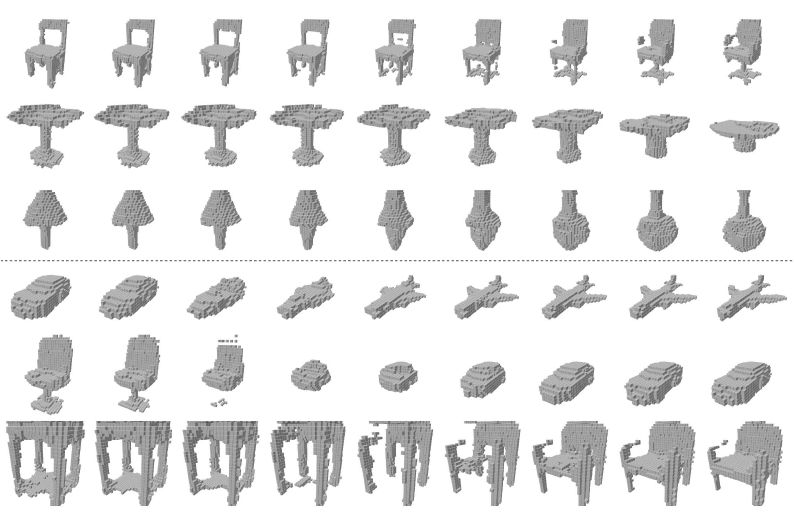 使用了来自ShapeNetCore数据集的体素化的32x32x32三维形状。其中选取了十类物体:飞机,汽车,椅子,陈列柜,电话,扬声器,桌子,长椅,船舶和橱柜。对于每一类,都是用ShapeNet的默认分割进行训练,验证和测试。