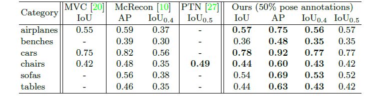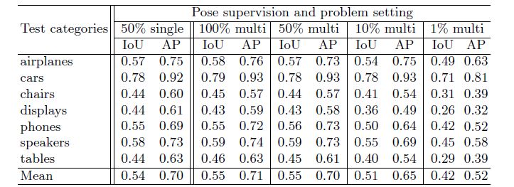 在该过程中,我们对每一类物体训练了一个单独的模型。我们对0到100%的姿态监督都进行了实验。我们将模型与现有的单目三维重建模型进行性能比较,结果如表1所示。