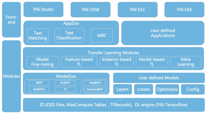 同时,经过了阿里内部 10 多个 BU,20 多个业务场景打磨,给 NLP 和迁移学习用户提供了多种便利,包括业界领先的高性能预训练工具链和预训练 ModelZoo,丰富易用的 AppZoo,高效的迁移学习算法,以及全面兼容阿里巴巴 PAI 生态产品,给用户提供一个从模型训练到部署的一站式服务。