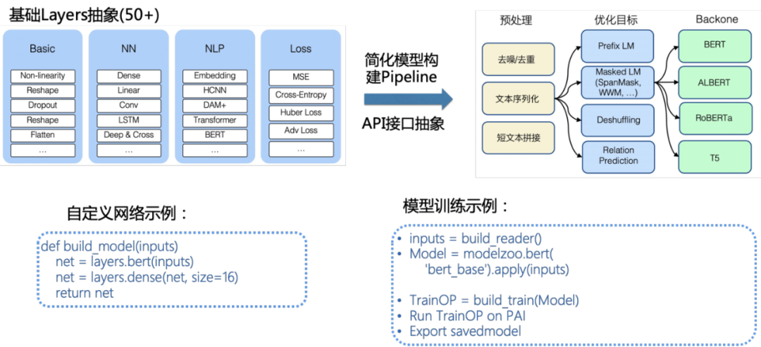 丰富且高质量的预训练模型 ModelZoo:支持 PAI-ModelZoo,支持 Bert,Albert,Roberta,XLNet,T5 等主流模型的 Continue Pretrain 和 Finetune。同时支持自研的多模态模型服装行业的 Fashionbert 等;