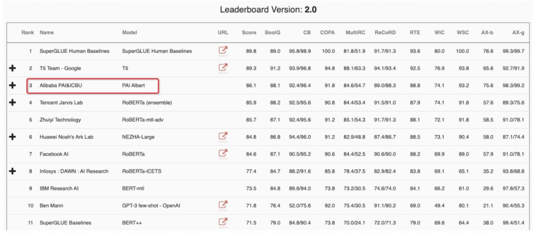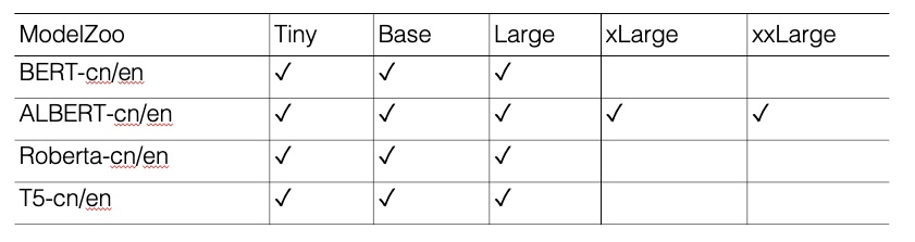 框架提供了一套预训练语言模型的工具供用户自定义自己的预训练模型,同时提供了预训练语言模型库 ModelZoo 供用户直接调用。目前支持了 20 + 预训练模型,其中在 PAI 平台上预训练的 PAI-ALBERT-zh 取得中文 CLUE 榜单第一名,PAI-ALBERT-en-large 取得英文 SuperGLUE 第二名的好成绩。下面是详细的预训练模型列表: