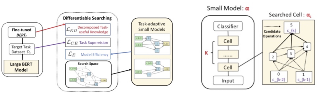 自动知识蒸馏工具:支持知识蒸馏,可以从大的 teacher 模型蒸馏到小的 student 模型。集成了任务有感知的 BERT 模型压缩 AdaBERT,采用了神经网路架构搜索去搜索出任务相关的架构去压缩原始的 BERT 模型,可以压缩最多到原来的 1/17,inference 最多提升 29 倍,且模型效果损失在 3% 以内;