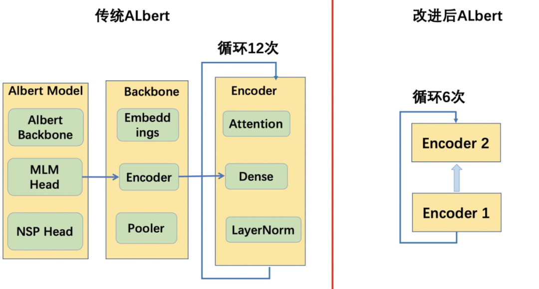 自然语言处理的一大热点工作就是预训练语言模型比方说 BERT,ALBERT 等,这类模型在各大自然语言处理场景都取得了非常不错的效果。为了更好的支持用户使用预训练语言模型,我们在新版的迁移学习框架 EasyTransfer 里植入了一套预训练语言模型的标准范式和预训练语言模型库 ModelZoo。传统 Albert 为了减少参数总量,取消了 bert 的 encoder 堆叠的方式,转而采用 encoder 循环的方式,如下图所示。全循环方式在下游任务上表现并不十分理想,于是我们将全循环改为了在 2 层堆叠的 encoder 上全循环。然后我们基于英文 C4 数据,重新对 Albert xxlarge 进行预训练。在预训练的过程中,我们仅仅使用 MLM loss,配合 Whole Word Masking,基于 EasyTransfer 的 Train on the fly 功能,我们实现了 dynamic online masking,即可以在每次读入原始句子的同时动态生成需要 masking 的 tokens。我们最终的预训练模型 PAI-ALBERT-en-large 在 SuperGLUE 榜单上取得国际第二,国内第一的成绩,模型参数仅仅为第一名 Google T5 的 1/10,效果差距在 3.5% 以内。后续我们会继续优化模型框架,争取以 1/5 的模型参数达到比 T5 更好的效果。