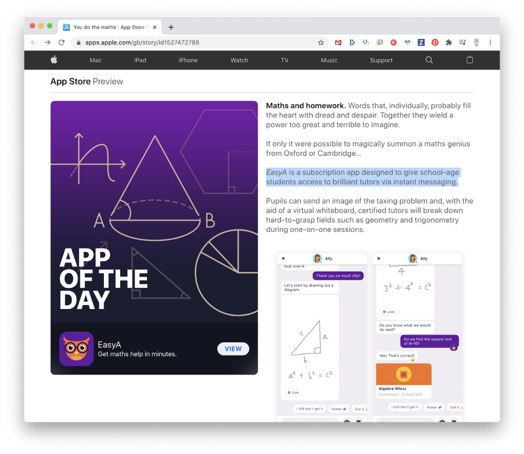 EasyA 是一款订阅应用,为适龄学生搭建了通过即时通讯与优秀教师沟通的平台,该应用使用 Flutter 编写。这款应用近日被 Apple 推荐为每日精选应用。