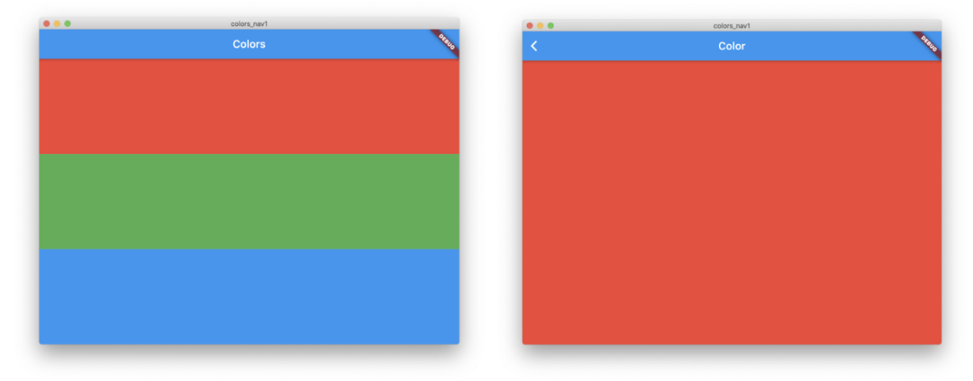 只需调用 Navigator.push() 即可将某一页面推入首页的上方,从而创建包含两个页面的堆栈。但与通过 ColorListScreen 的 build 方法创建的一系列 Containers 不同的是,该堆栈将对您隐藏。而且由于堆栈被隐藏,在其他场景中将难以对其进行管理,例如处理由原生嵌入、网址或 Android intent 等提供的初始路由中包含的深链接。管理同一页面的不同排列形成的嵌套路由时也十分困难。