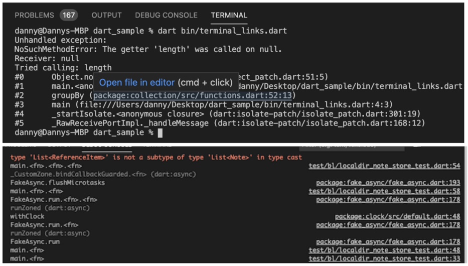 对于所有 Flutter 开发者而言,在终端或堆栈分析结果中查看错误输出并继续解决问题都是一项必不可少的例行工作。在 Visual Studio Code 的最新版本 Flutter 扩展中,现已能够正确解析这些链接,使您可以直接在输出结果中使用它们。