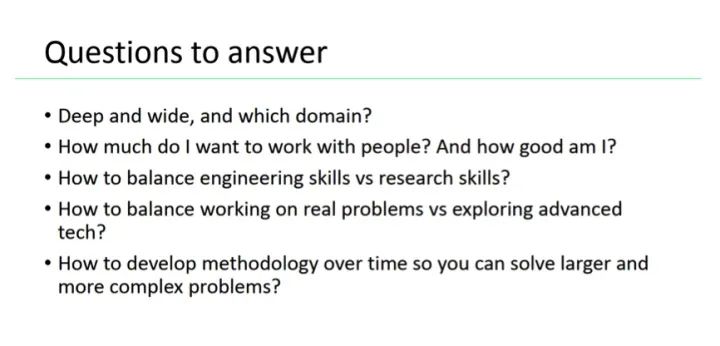 这次分享不是为了给大家具体的答案,而是希望能够引发大家对于算法工程师/研究员职业发展问题的思考。人无远虑必有近忧,想清楚后早做相应的规划和准备。接下来会给大家提出几个问题: