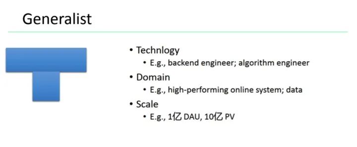 接下来给大家介绍一下人才模型,在给定了公司架构后,你要怎么做呢?大家可以看这个图,一个大写的字母“T”。这是我经常给Hulu的同事讲的,我们要想象我们的技能就像一个“T-shaped”。也可以比喻为大家熟识的“wide&deep”算法,就是你要走多宽,你要走多深。
