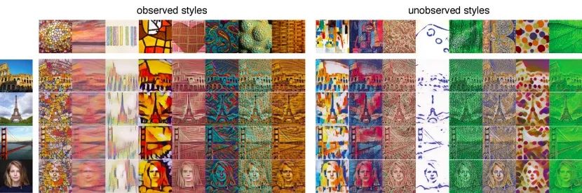 网络是联合训练的,但它只用少量训练图像就模拟了多种风格,这意味着我们没有必要为每种风格单独设定拉格朗日乘数λs。 也就是说,同一个损失加权就足以在所有绘画风格和纹理上产生合理的结果。上图(右)则证明,该模型能够预测以前从未见到的风格和纹理样式,它们在质量上与训练集样本的风格和纹理几乎一致。