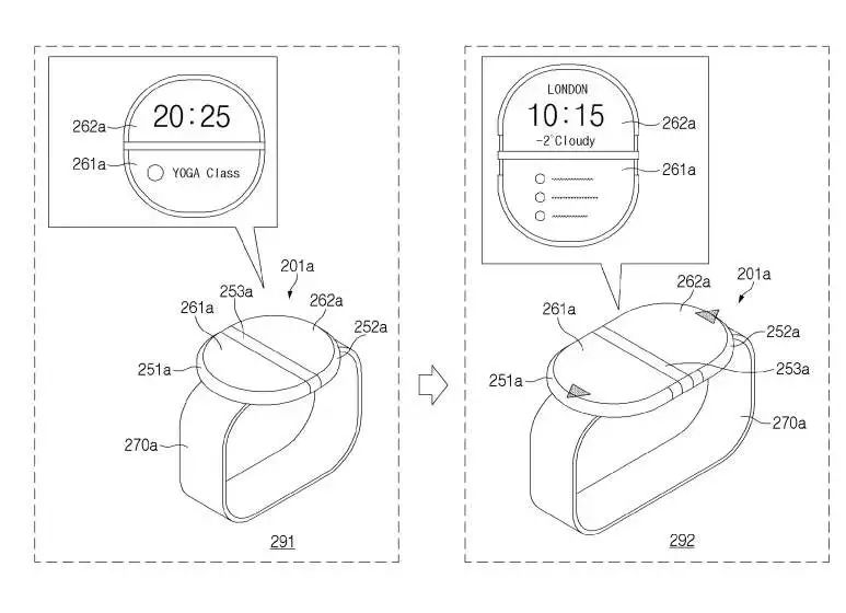 此外,中间的框架也容纳了一个摄像头,可以选择内置几个摄像头传感器甚至是闪光灯。这款相机可以同时拍摄照片和视频。目前这只是一个专利,虽然已经详细描述了各种操作的可能性,但尚不清楚三星是否打算量产这款智能手表。也许,三星会先推出一款卷轴屏手机,才推出这款智能手表。