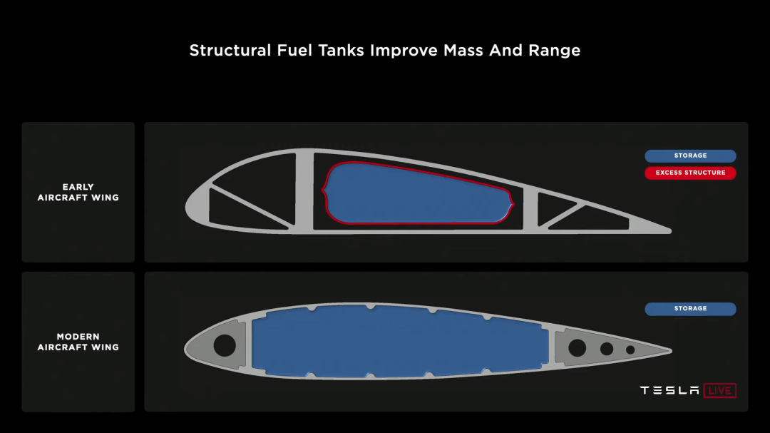 要说最贴切的形容还得是特斯拉,这张飞机机翼剖面图形象地说明了 CTC 设计的精髓。现代飞机充分利用机翼空间储存燃油,除了增大了载油量和航程之外,也利用油箱的结构参与机翼受力,从而减少了机翼所需的额外支撑结构,减轻了重量。