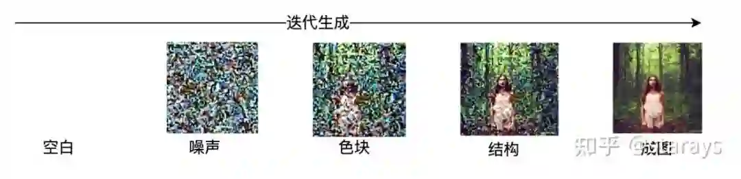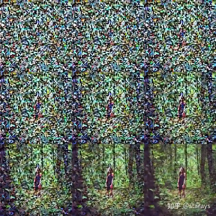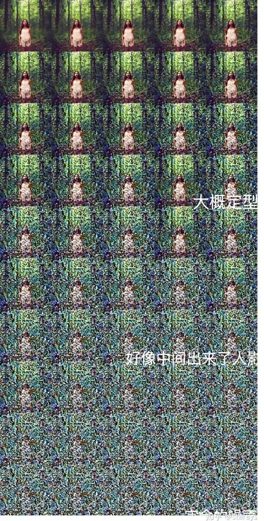 ▲ 图2:扩散模型生成图片的过程 所以,我们也可以将 Diffusion Model 生成图的过程同样视为一种「创世演化」模型:从一张空白的图片,通过随机的采样(量子涨落)生成无意义的噪点(基本粒子);由模型提供「物理定律」的引导,从噪点逐步演化出颜色、线条、纹理,进而构成物体、人脸、意象、场景、画面。从这个层面来说,Diffusion Model 的运行原理和人类的思维是完全不同的,Diffusion Model 作画是一个 down-top 的过程。 人类作画则是 top-down 的:先有场景——如「一个美丽的少女走在森林中」,有经验的画师会勾勒出只有几条线的再逐步细化画面中的每一个元素:少女在哪里,森林里有几棵树,然后少女是什么面容、穿什么衣服,森林里的树是哪些种类;而 Diffusion Model 则是:先随机地生成像素,然后从这些像素中慢慢浮现出人物、场景等。 下图是经过 50 步迭代生成「少女在森林中」的一个过程,右下角是最原始的噪声图像,从右到左、从下到上依次迭代;每一步的生成都和上一步的结果相关(一阶马尔科夫链)。 可以看到,一开始,图像是完全的噪声,什么都看不出来;经过十几步的迭代后,如果有足够的想象力,应该可以联想到,中间浮现出的一片白色似乎可以绘制成一个人影,后面杂乱无章的大片绿色纹理经过细化应该可以画成森林背景;再经过十几步的迭代,图像已经基本定型,人和森林的轮廓都出现了;经过多次迭代,最终生成了一张合乎逻辑和语义的图片。