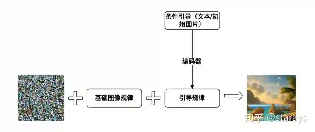 在类比创世游戏的图像生成过程中,我们知道,「物理定律」是「宇宙生成游戏」中的一个重要组成部分。缺乏物理定律的约束,完全随机的量子涨落会产生一个即使是在微观尺度上也是各向同性的、充满了躁动的虚粒子的宇宙;类似地,如果在图像生成过程中缺少规则的约束,那么,图像将永远是一堆噪点。 在 Diffusion Model 中的「物理定律」包括两个部分,分别对应生成的两种模式:无引导的生成和条件引导的生成。 我们先看无引导的生成。无引导的生成以创世游戏来类比,对应的是「基本物理规则」:假如我们在 Big Bang 之后产生的空间中划定一块,只规定基本的物理法则,那么这块空间中,通过随机量子涨落和物理法则的共同作用,可能产生星云,也可能产生恒星、黑洞,甚至是一个生命聚集的群落。 而在图像生成过程中,生成的结果如何,则决定于初始的规则和模型从「样本构成的数据宇宙」中学习到的知识:如果数据集中只有人脸的图片,那么通过无引导的生成过程,绝不会产生一只狗的照片,而是会生成一张人脸,因为模型只能从这些数据中学习到「如何生成人脸」的「物理定律」。而对于一个包罗万象的数据集训练出来的模型,做这个实验则有意思的多: