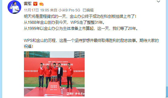 “明天将是里程碑式的一天,金山办公终于成功在科创板挂牌上市了!