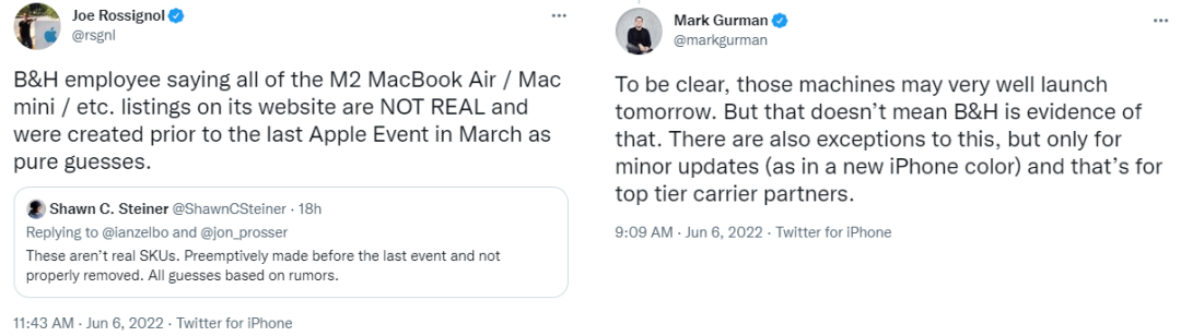 MacRumors 的 Joe Rossignol 援引 B&H 员工说法表示,这些页面在苹果三月发布会之前就已创建,更多的还是占位符。古尔曼也如此认为,但同时强调,新款 MacBook Air 等设备确实会在 WWDC 上亮相。
