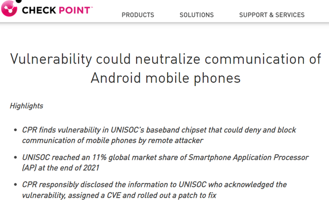 近日,网络安全研究公司 CheckPointResearch 公布了其对紫光展锐芯片组基带处理器中发现的新漏洞。根据相关报告称,紫光展锐芯片组目前存在一个 9.4 级严重网络漏洞,该漏洞会影响作为芯片组一部分并负责网络连接的网络调制解调器,可能允许攻击者发送损坏的网络数据包,并禁用或中断设备的网络连接。