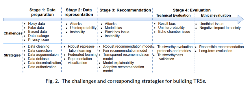 上一节分析了可信推荐系统四个阶段,这四阶段中每一个阶段都面临着不同的挑战。因此,在本节中分析了每个阶段所面临的问题和特殊挑战。