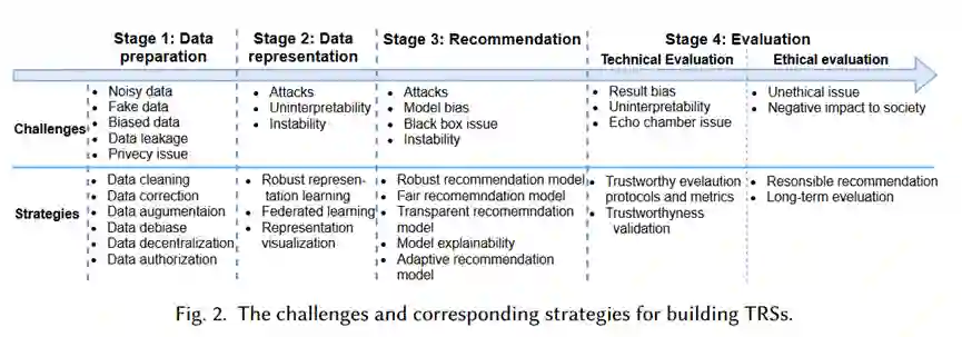 可信推荐系统(TRS)是一个极具挑战性且要求很高的课题,具有很高的理论和实践价值。在本文中,我们对该主题进行了全面的概述,通过全面分析指定推荐系统可信度的各个方面来全面描述可信推荐系统;提出了一个新颖的四阶段框架来系统地说明可信推荐系统,并分析了在构建可信推荐系统的四个阶段中每个阶段的相应挑战。我们还描述了一个支持可信推荐系统的概念框架,并指出了这个充满活力的领域的一些未来方向。可信推荐系统的研究正在蓬勃发展,我们希望这项工作能够让读者全面了解构建可信推荐系统的关键方面、主要挑战、关键技术,并为未来的研究提供一些指导。