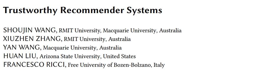文章题为《Trustworthy Recommender Systems》,论文第一作者为悉尼科技大学数据科学研究所助理教授汪守金博士。他在数据挖掘、机器学习、用户行为分析与建模、时序数据分析、推荐系统和虚假新闻检测等方面有着较为深入的研究。这篇文章是可信推荐系统方向的一篇较为系统全面的综述文章。全文共16页,包含7个章节、3幅插图和58篇该领域内有代表性的参考文献。汪守金博士经过长期的积累和思考,对可信推荐系统这一领域进行了全面而深入的梳理和总结。