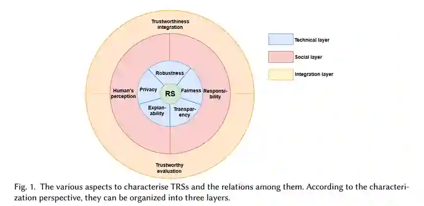在一些相关领域,例如可信人工智能,已经提出了许多不同的方面来从法规、机制和技术等角度来指定“可信”。与技术视角相关的几个方面已得到普遍认可,包括鲁棒性、公平性、可解释性、透明度、隐私性、问责制和责任感。由于RS是人工智能的特定应用领域,因此用于定义可信人工智能的方面也适用于定义可信RS。但是,由于RS的数据特性、工作机制和计算任务非常特殊和具体,因此还要考虑人的感知和可信度评估等RS场景特有的附加方面。它们可以很好地区分可信RS和可信人工智能。接下来,我们说明了表征可信RS的各个方面。