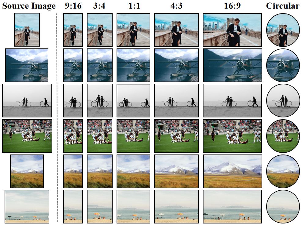 其次,我们对三类图片展示最优裁剪结果: 有一个显著的物体、有多个显著物体和没有显著物体。对于每一类,我们展示两张图片在五个长宽比(9:16、3:4、1:1、4:3和16:9)下的最优剪裁结果。在第三类没有显著物体的图片中,之前的基于显著性的方法可能会失效,因为它们依赖于显著物体的检测结果;然而我们的模型仍然可以达到令人满意的结果。这表明了我们模型的泛用性。