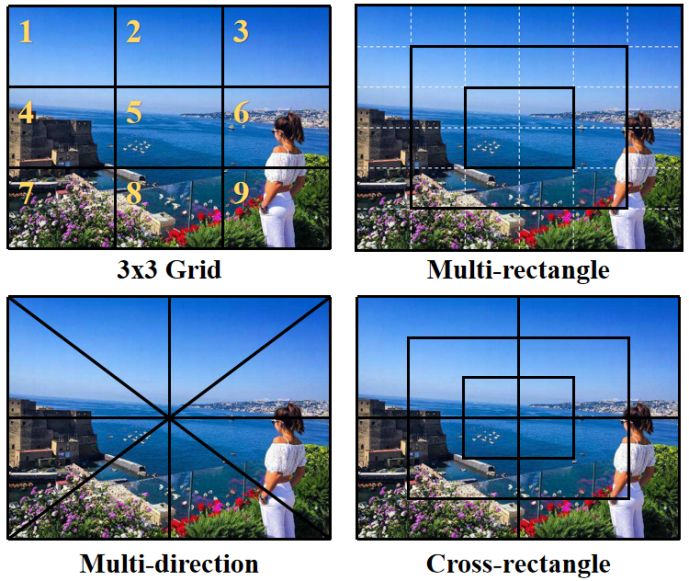 为了找到最佳子图,图像裁剪模型一般会先生成大量的候选子图,然后对每张子图逐个进行美学评分,最终确定评分最高的子图。因此,一般来说,图像裁剪模型通常由候选子图生成模型和美学评分模型两个部分组成。早期的研究通过利用一些摄影知识来实现美学评分,比如使用人类总结的构图规则,像是三分法和中心法则。它们通过定义并抽取相应的特征来衡量子图的构图优劣。