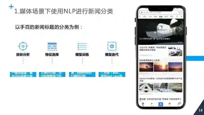 首先我们看第一个媒体的场景,比如说手机百度,我们在使用手机百度时候除了搜索之外,可以看一些新闻的内容,可以看到有一些频道,小说、健康、科技、娱乐等频道,如何从全网里或者是各个网站导流进来的文章做分类?其实就可以应用到文本分类的模型。首先这边遵从这四个步骤,比如目标分析,我们看一下我们需要对拿到的数据、文章做一个频道的分类,也就是说对文章做一个分类。在特征选择过程中我们应该选择哪个特征,首先可以看到,新闻的标题很多情况下都能够反映出这个文章的主题,所以我们就直接选择文章的标题作为训练数据,训练完这个就按照之前说的,确认这个标题对应的标签,比如说它是科技、娱乐还是健康的。我们准备数据,完成模型的训练,再做模型的小流样上线,之后看一下具体有一些案例,再做数据集的添加,这样可以不断优化我们的效果,通过这四个步骤可以很容易训练出一个文本分类的模型。