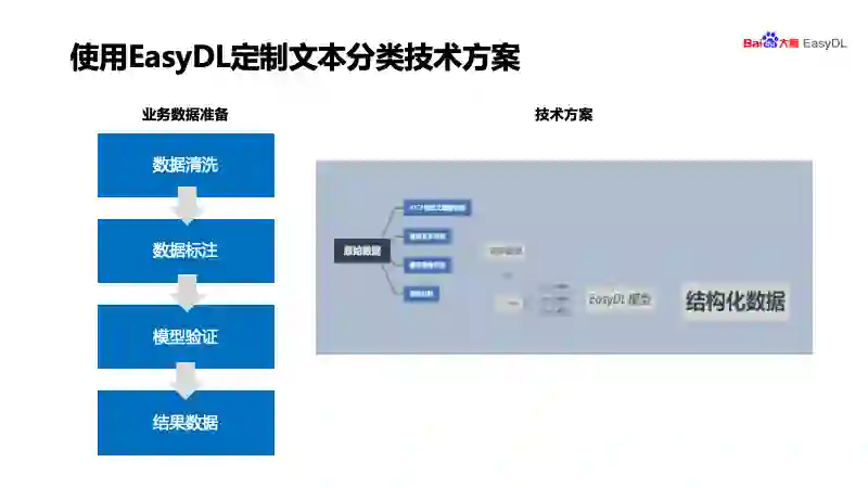 之后是一个常规用EasyDL定制文本分类模型的简单方案。首先是数据清洗流程,其次是数据标注过程,之后会训练出一个最初版本的模型,这个模型如果想要在业务上应用落地,它是需要大量的验证的过程,最后迭代出若干个版本,最后某一个版本才能满足你业务上的需要。最后通过你的可用的模型,再来套用工作中或者实际应用场景中需要进行分类的数据,最后得出来一个结构化的的结果。