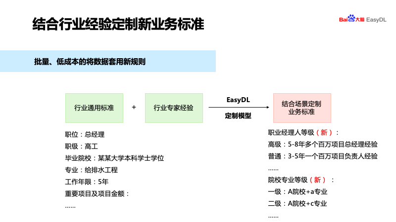 EasyDL的能力,我们可以通过EasyDL定制一个模型,这个模型是通过行业的通用的标准加上从业人员的专家经验,能够非常低成本、高效率制定出来这个模型,这个模型可以套用到许多的业务场景中的文本信息。之前我给百度录过一个小的VCR,这个VCR中提到,之前有将近200万条关于候选人的数据,这是我们在将近20年从业中积累下来的信息,这些信息如果我们单纯靠人工进行标注的话,可能5个人的团队要标注10年左右标完,但是借助EasyDL的能力,最后一个版本这200万条数据大概经过了5个小时左右,就把这3个模型分类进行了结构化的标注,所以说不管是人工智能还是EasyDL,在我们实际业务的应用中真的起到了非常大的效率。